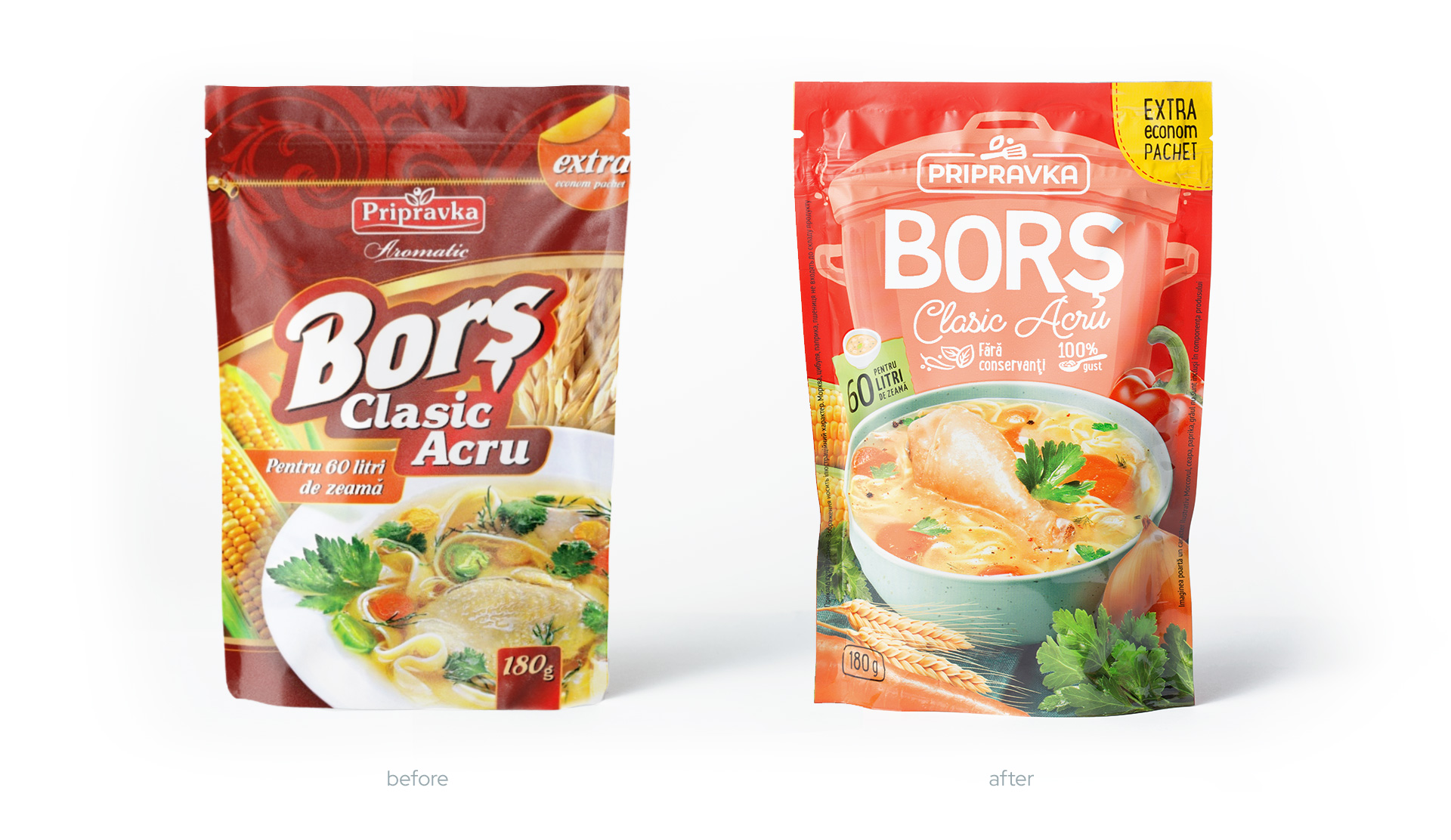 This is sour soup with chicken and homemade noodles. The signature taste can be obtained by adding kvass or “Bors” seasonings. Our task was to modernize the packaging, which has been on the market for a long time, and leave the association with homemade soup. Generous in terms of ingredients and rich in taste.